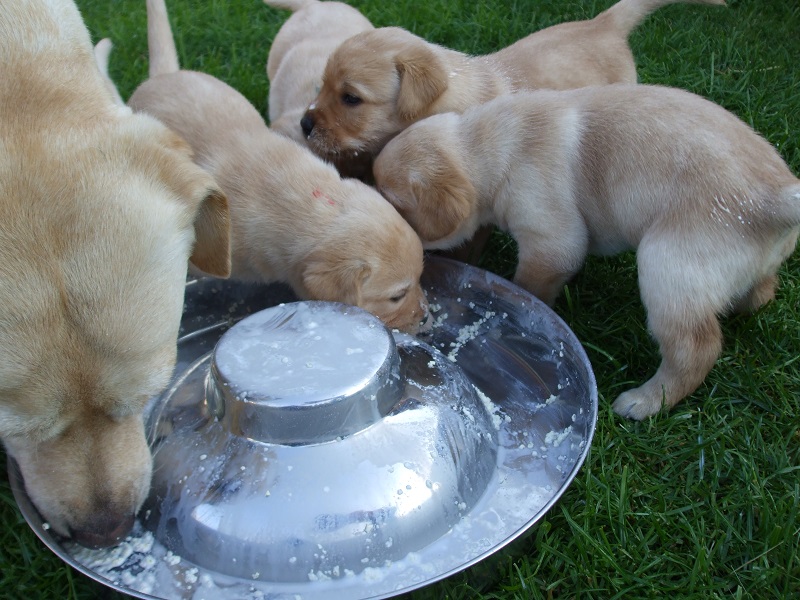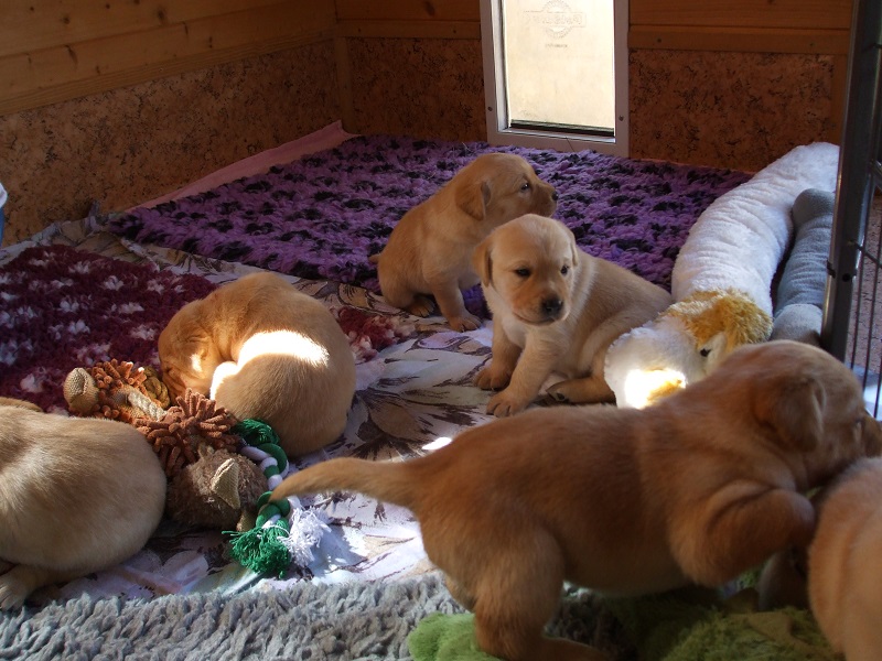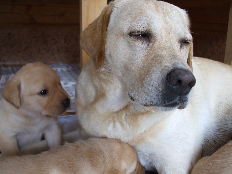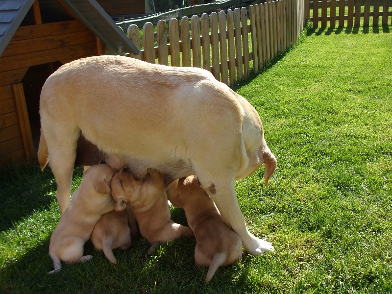 "Welpenhausen"? Die Welpen spielen nun schon miteinander, versuchen sich im knurren und bellen ... irre! ... das hört sich so lustig an, da könnte man sich wegwerfen. Die Zähnchen sind da und sie fangen an sich gegenseitig damit zu ärgern. Sie reagieren auf unsere Stimmen und unser Erscheinen. Wie schön. Wir schieben sie manchmal durch die Klappe nach draußen, damit das ein- oder andere Pipi draußen gemacht wird. Quittiert wird erst mal alles mit mächtigem Geschrei, dass aber schnell aufhört, wenn ..... | ..... Mama Kayleigh auch draußen die Milchbar öffnet. Wie praktisch für die Mäuse :-)) |
