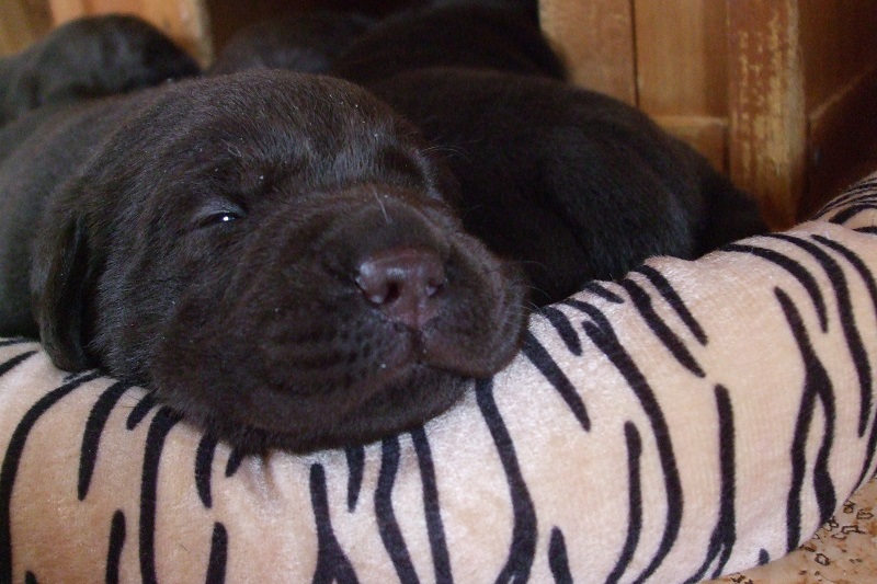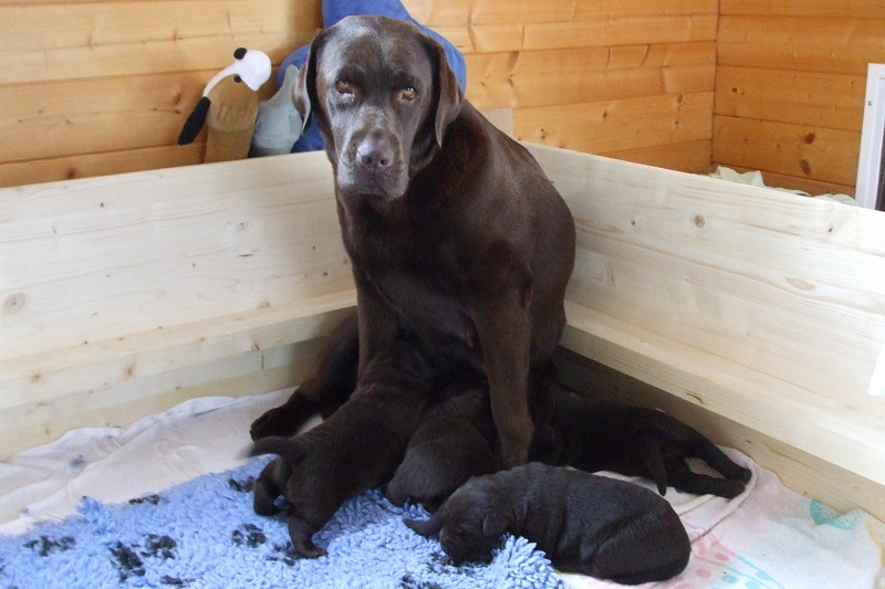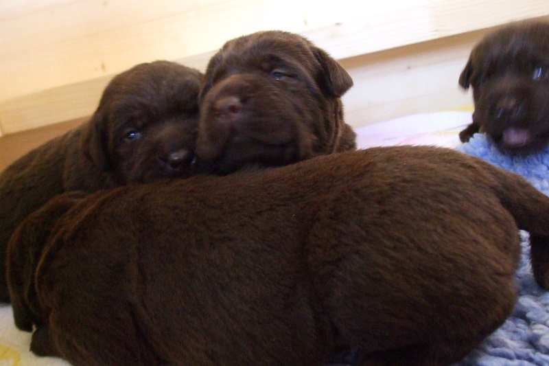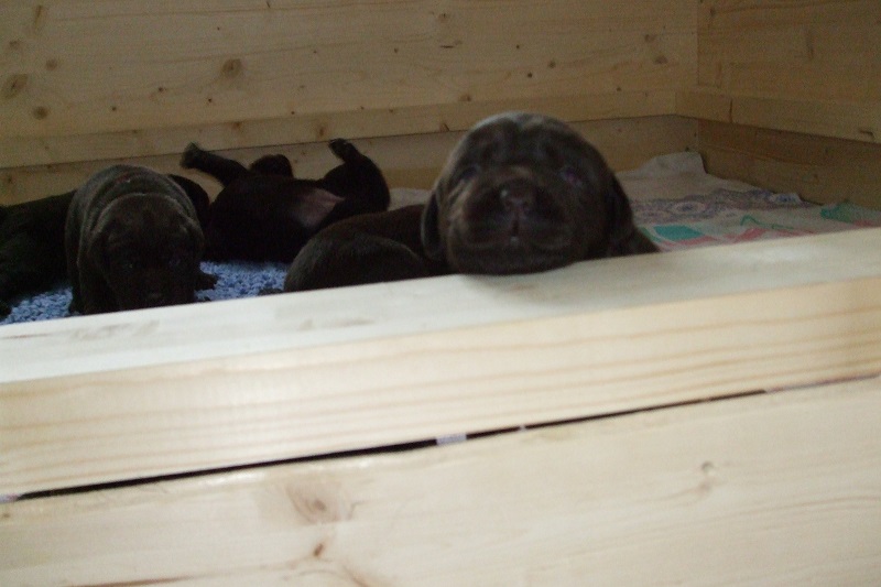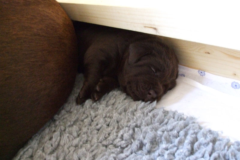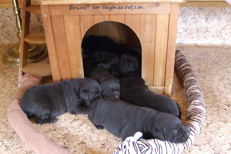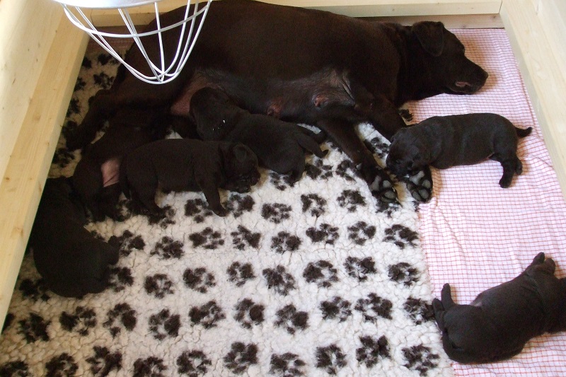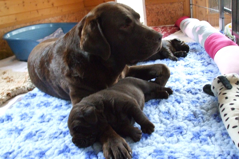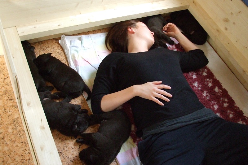 Süße Träume. Besonders wenn Mama in der Nähe ist. | Ab jetzt haben die Welpen mehr Fläche zur Verfügung. Die Wurfbox ist raus und das Welpen-Innen-Gehege steht. |