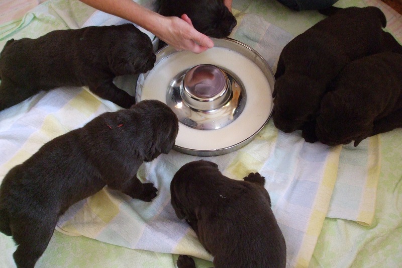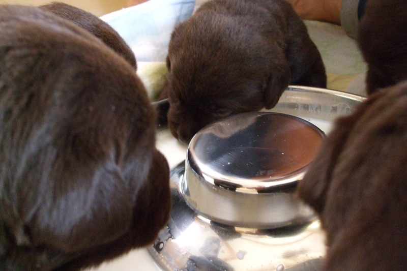 Die erste Ziegenmilchmahlzeit.... | .... gar nicht so einfach aus dem Welpenring zu trinken. |