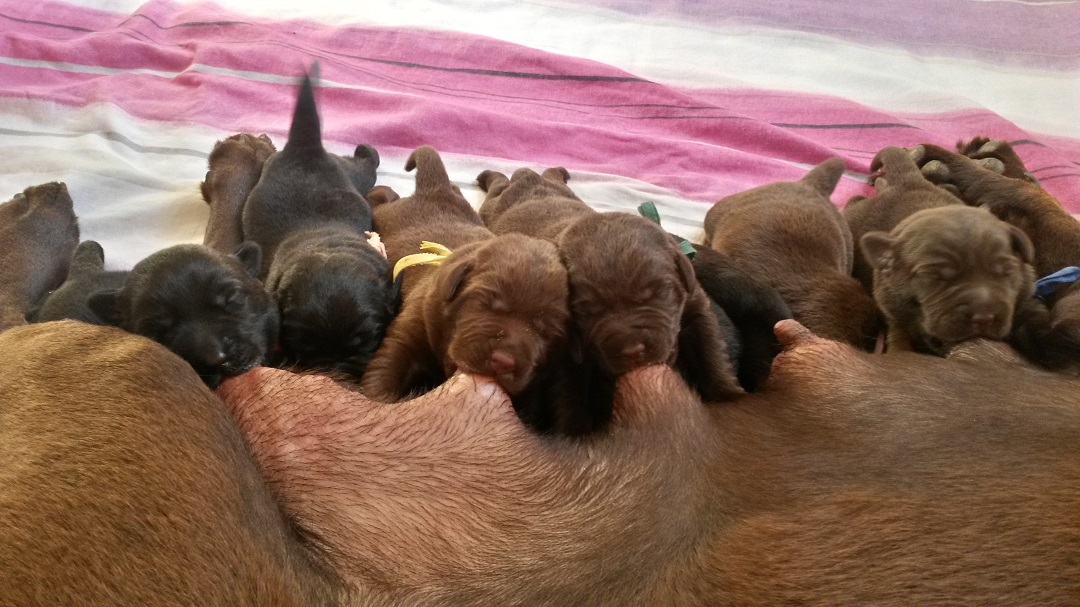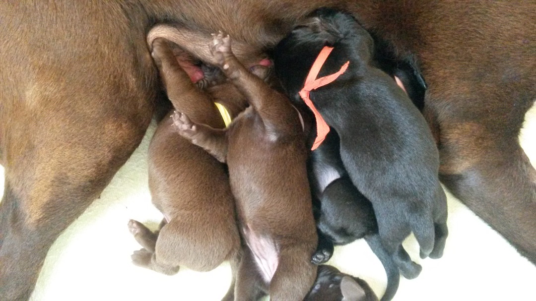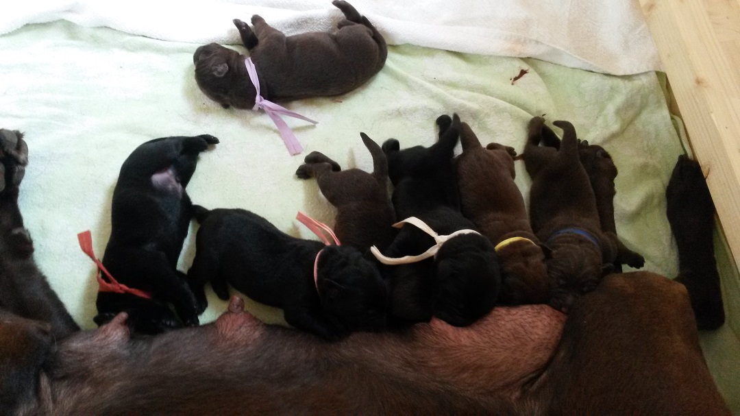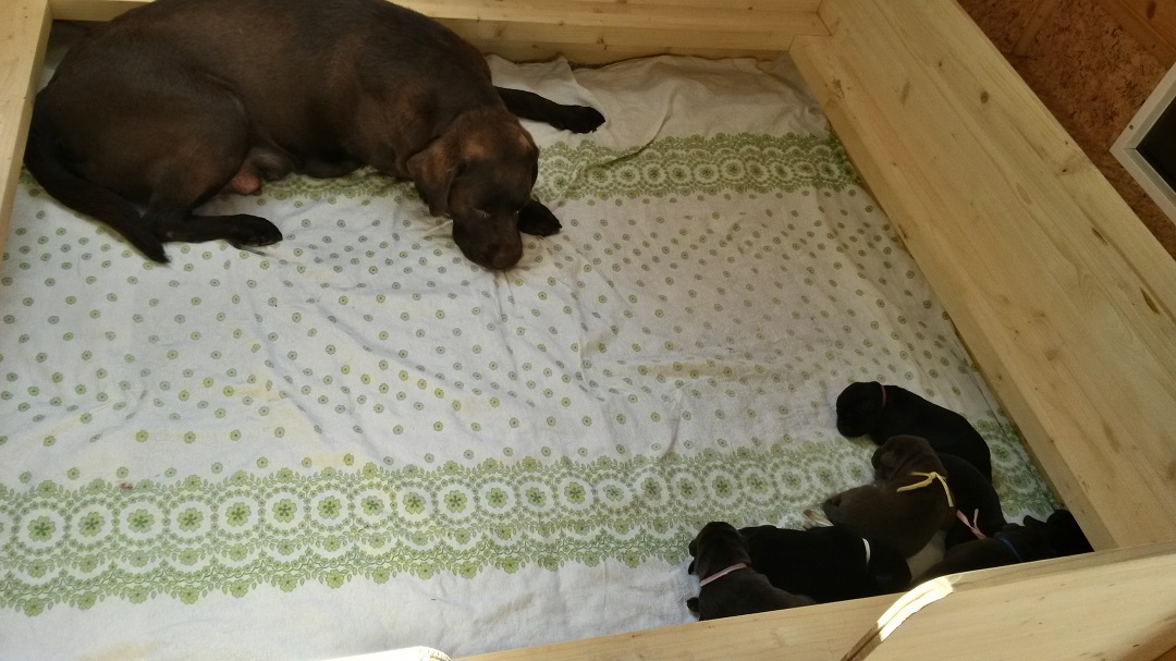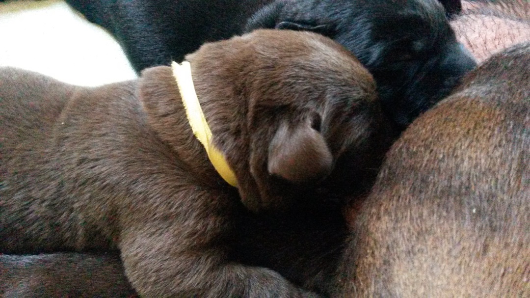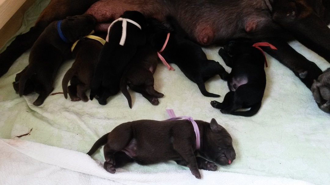 kurz vor, ob Rüde oder Hündin und welche Farbe das Bändchen () hat. links Rüde schwarz (terrakotta), Hündin schwarz (rosa), verdeckt Rüde choc (grün), Rüde schwarz (weiß), Hündin choc (gelb), Rüde choc (blau) und oben Hündin choc (flieder) | Die drei Mädels beim Frühsport :-) links Hündin choc (gelb), Hündin choc (flieder), Hündin schwarz (rosa) |