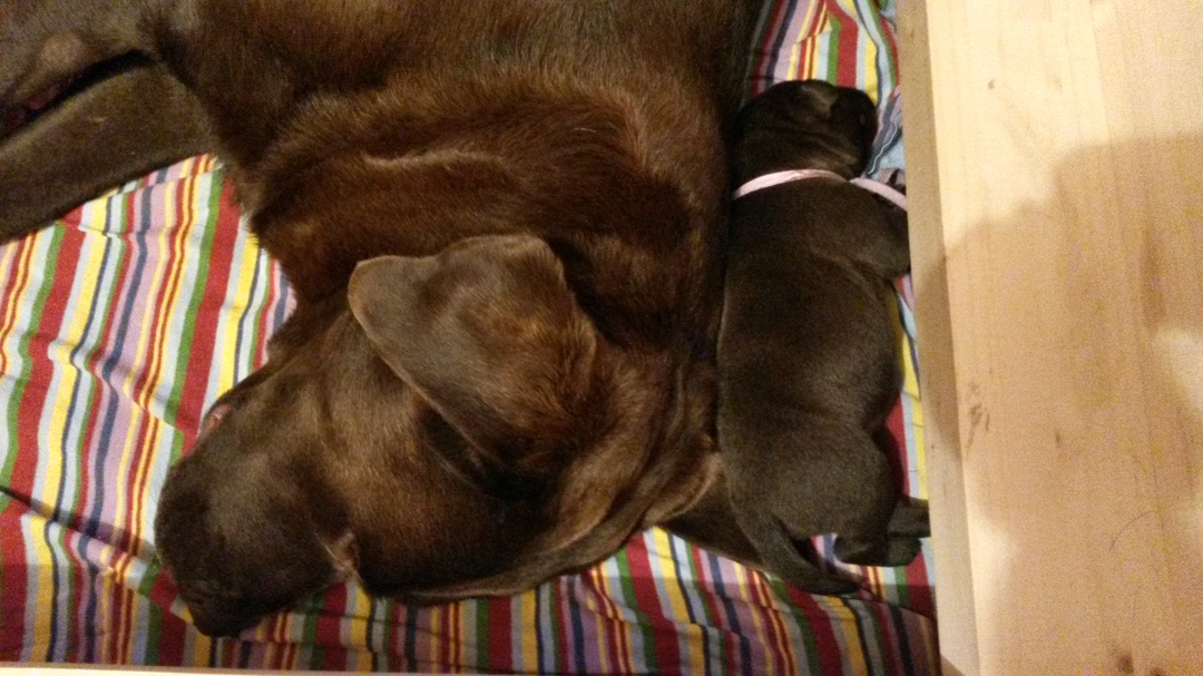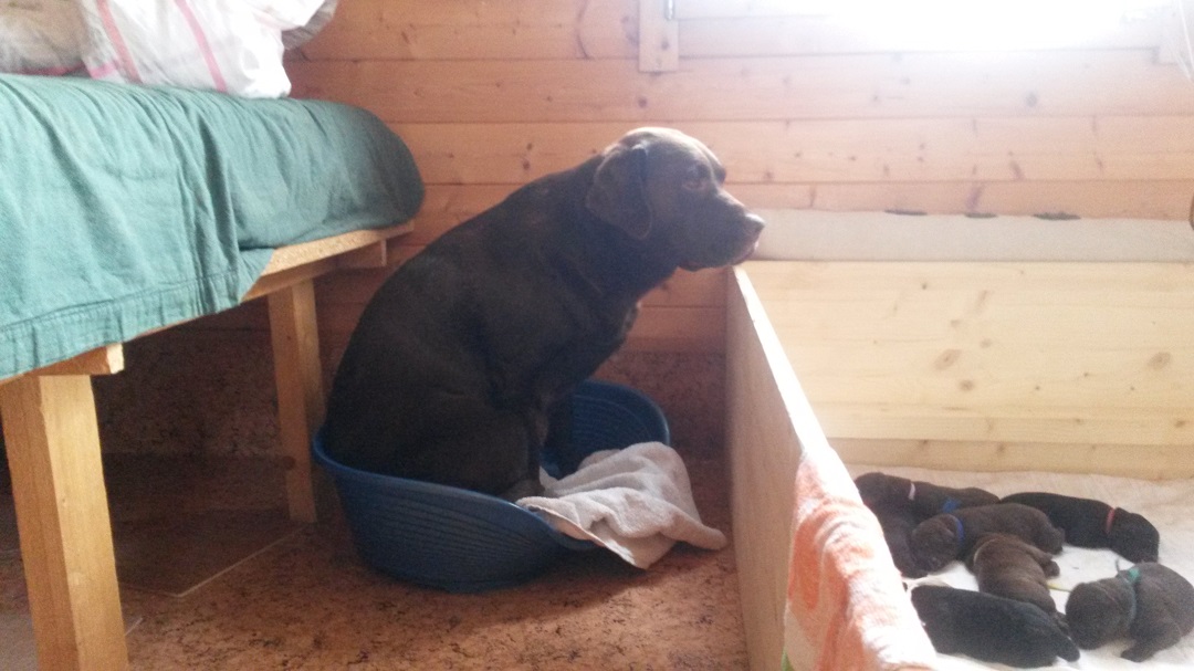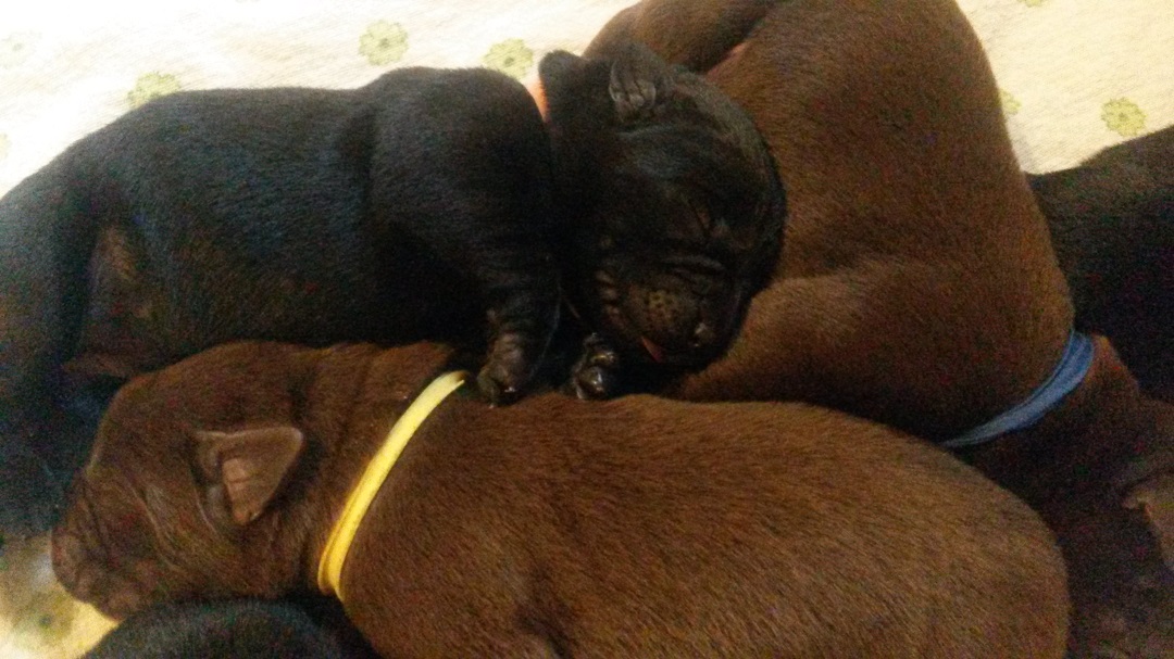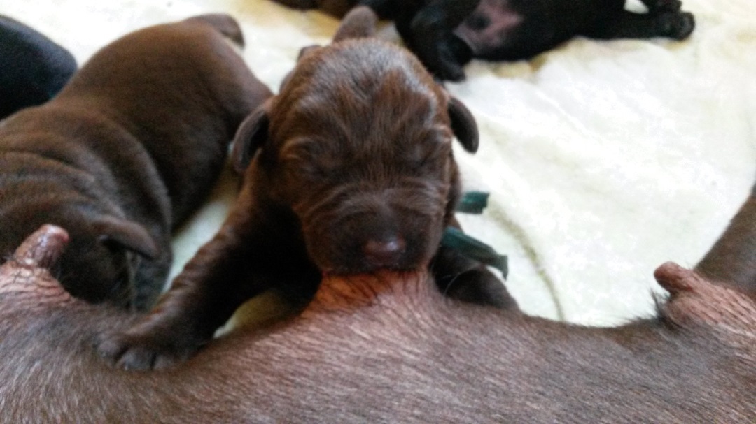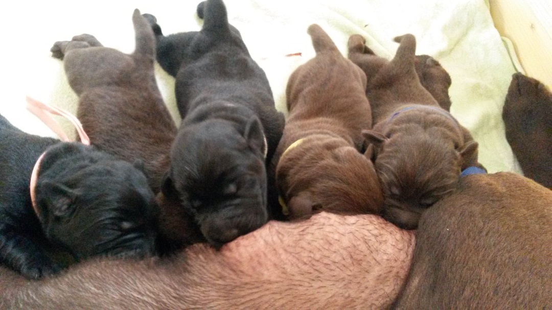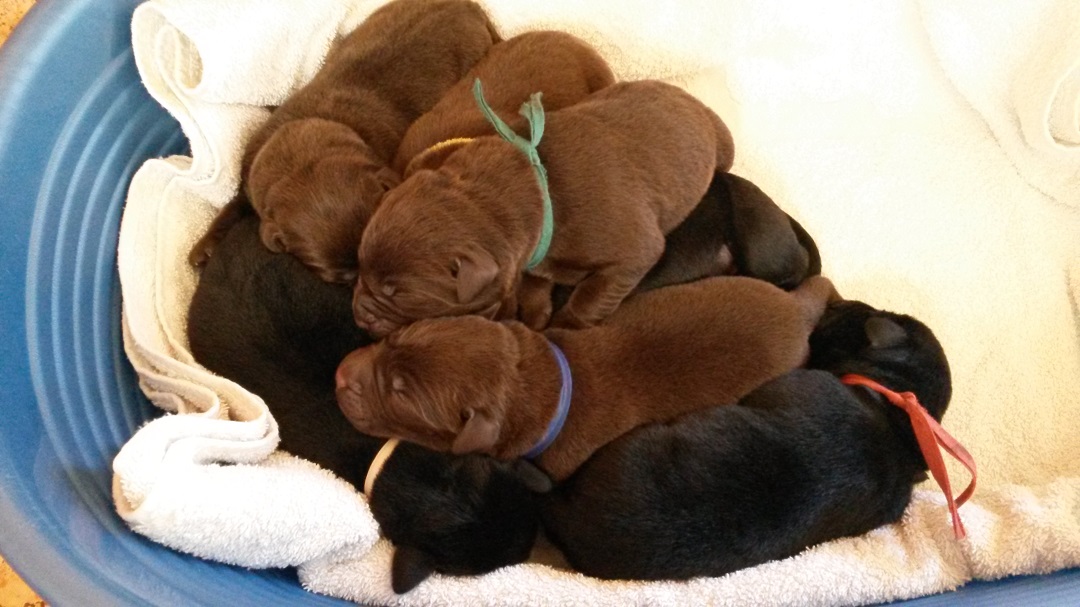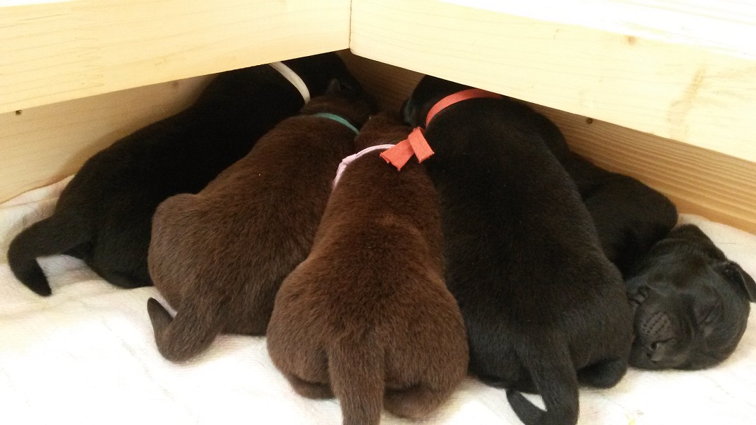 kurz vor, ob Rüde oder Hündin und welche Farbe das Bändchen () hat. links Rüde schwarz (terrakotta), Hündin schwarz (rosa), verdeckt Rüde choc (grün), Rüde schwarz (weiß), Hündin choc (gelb), Rüde choc (blau) und oben Hündin choc (flieder) | Die drei Mädels beim Frühsport :-) links Hündin choc (gelb), Hündin choc (flieder), Hündin schwarz (rosa) |