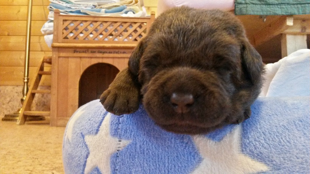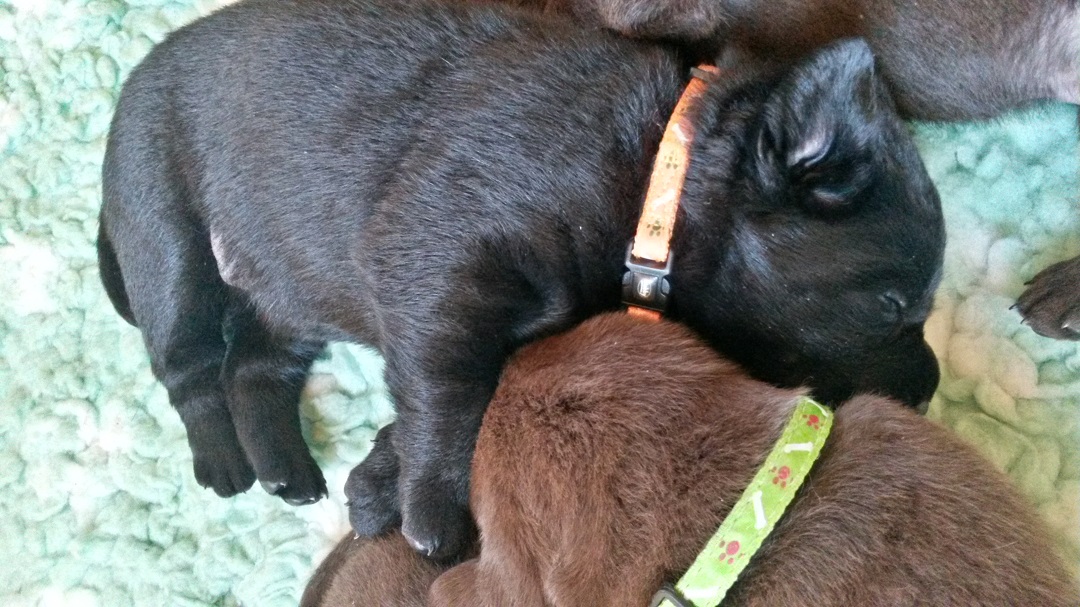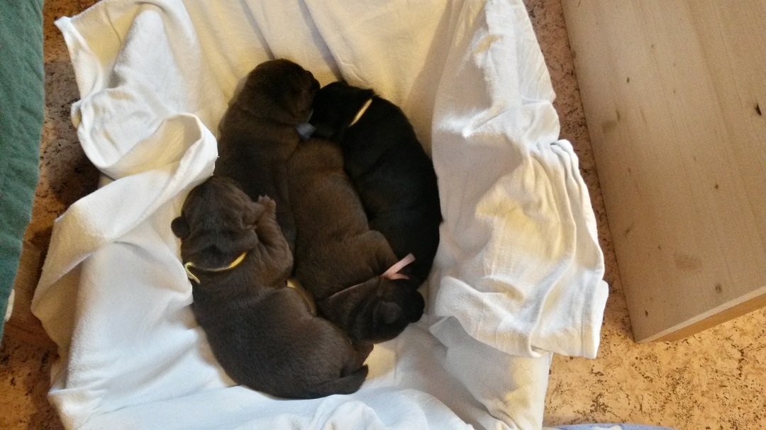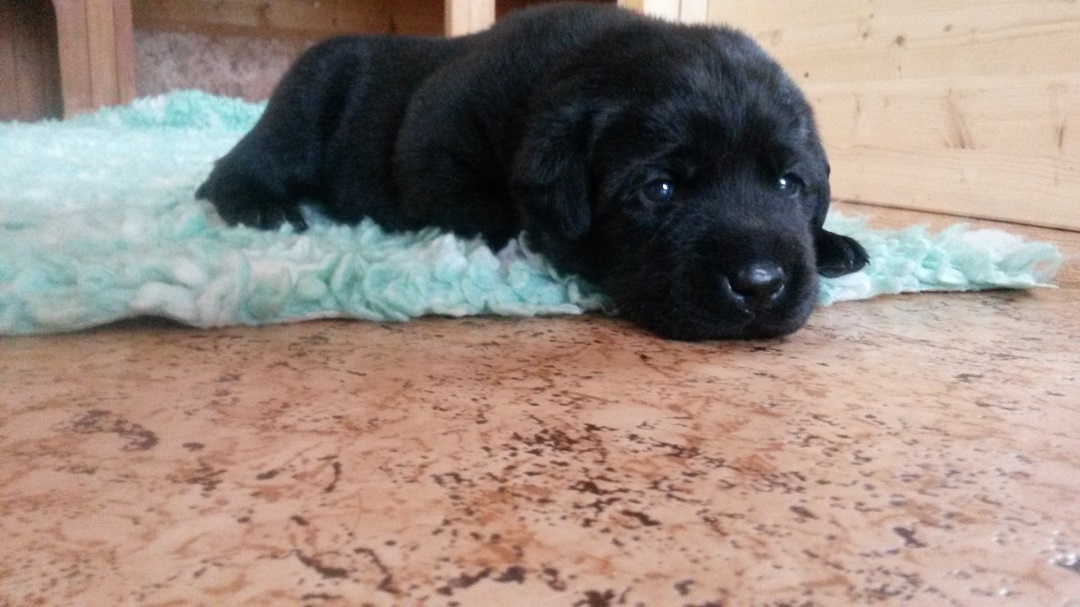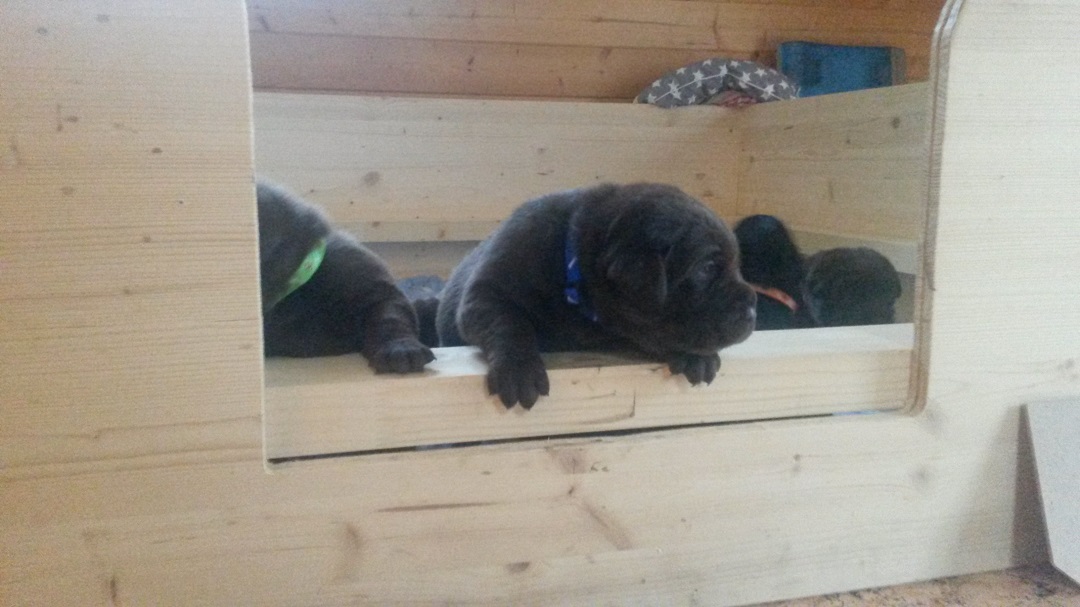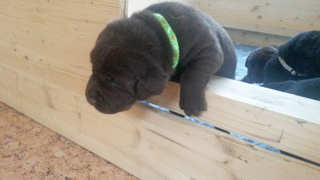 Ab heute kommt Farbe ins Spiel. Habe jedem Welpen ein buntes Halsbändchen verpasst :-) (hier Jolene) Ausser, dass sie die Augen aufmachen und agil werden..... |