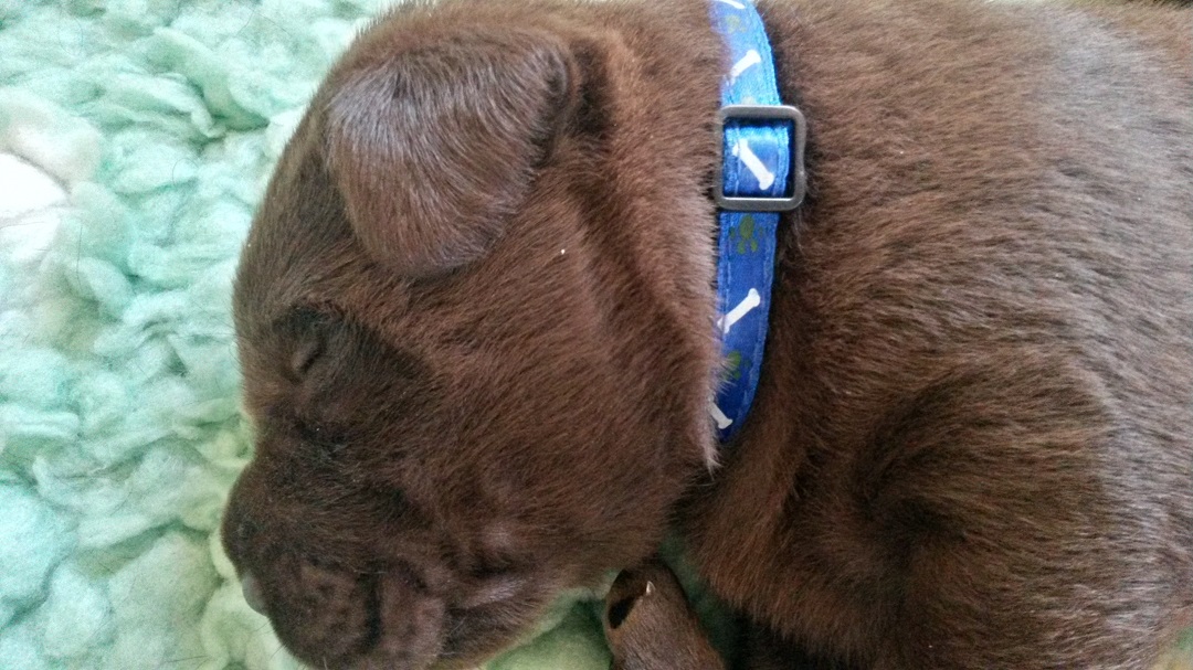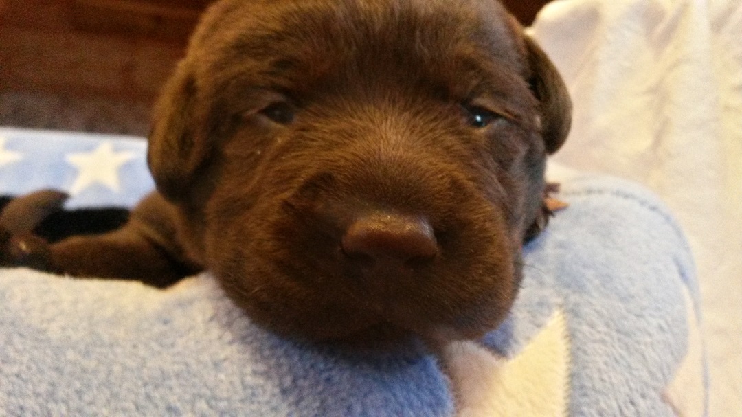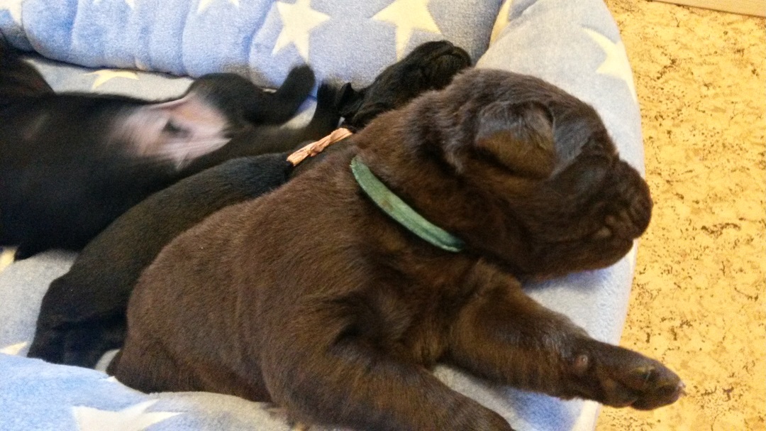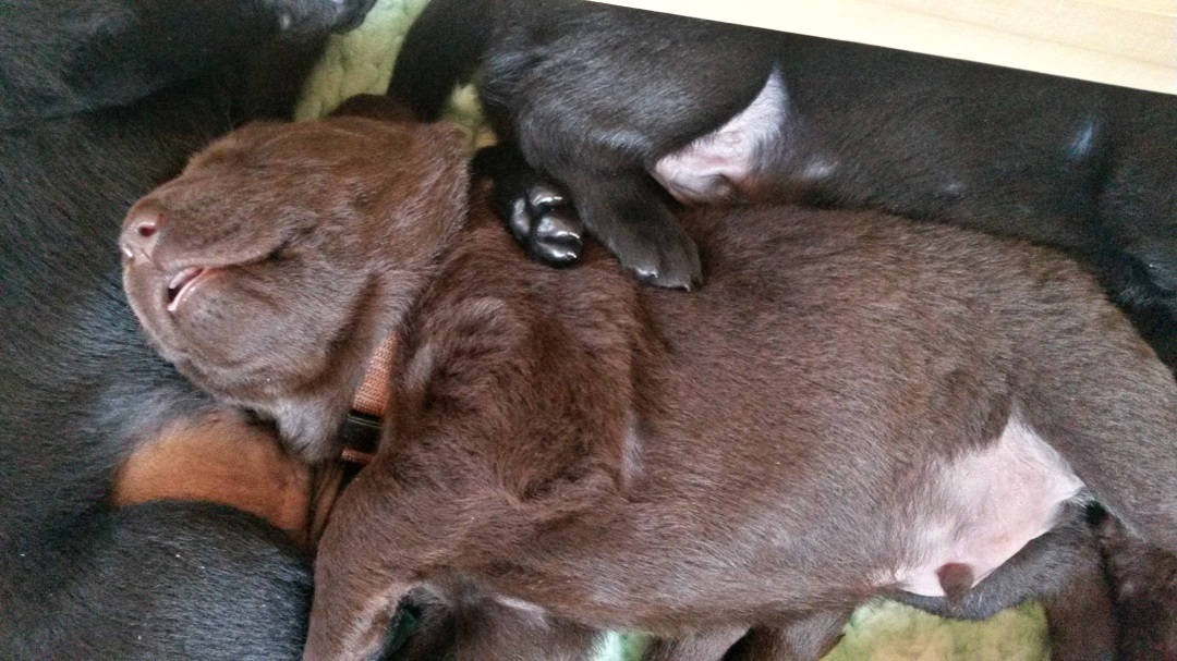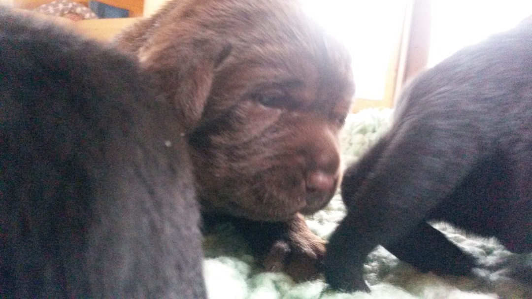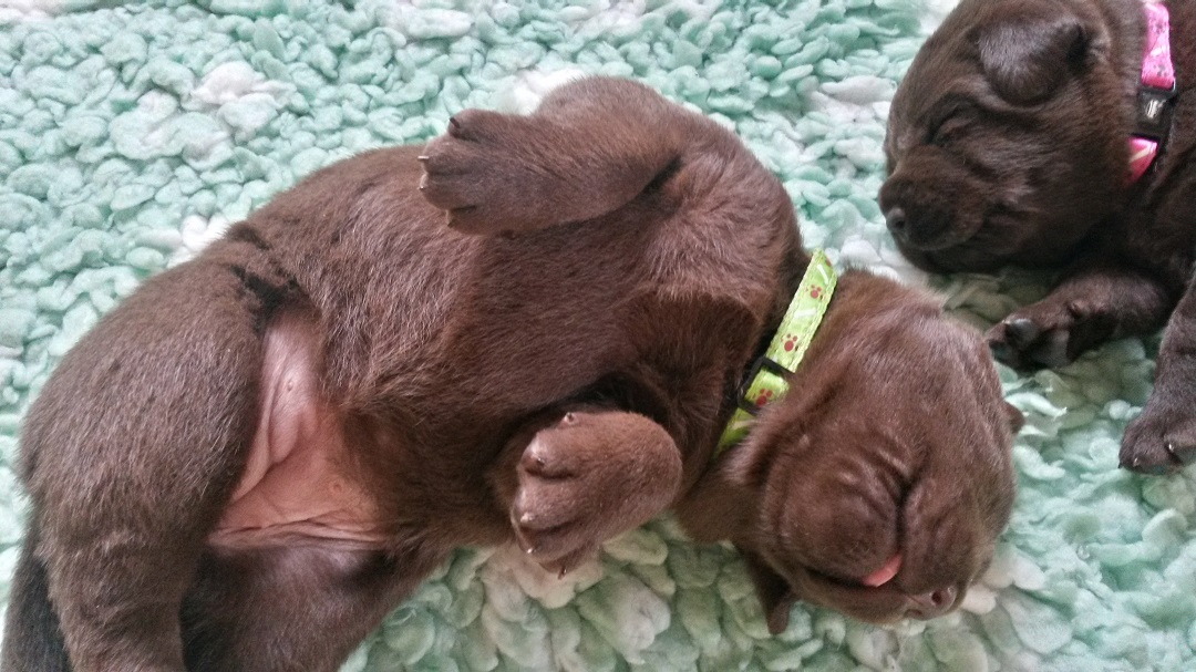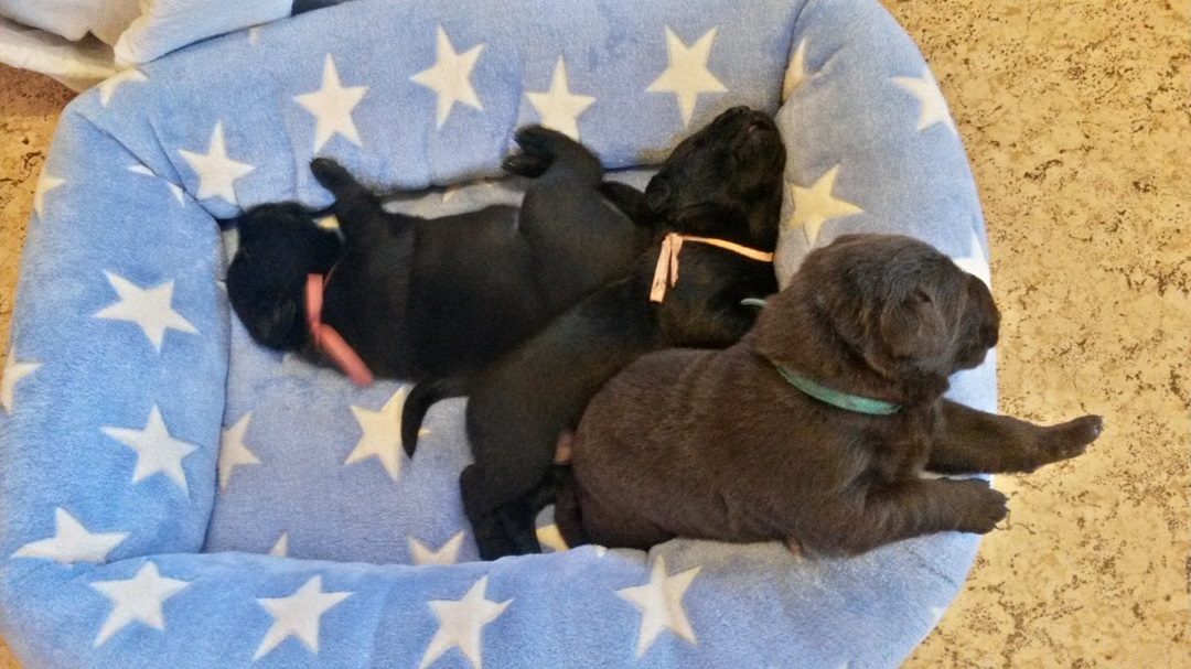 Ab heute kommt Farbe ins Spiel. Habe jedem Welpen ein buntes Halsbändchen verpasst :-) (hier Jolene) Ausser, dass sie die Augen aufmachen und agil werden..... |