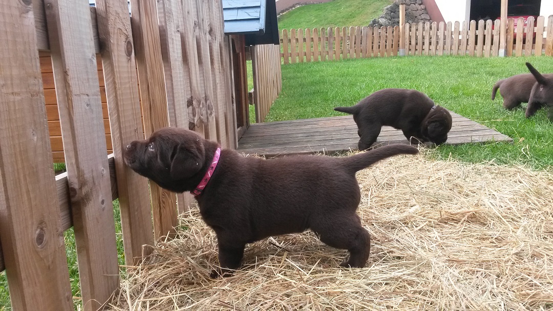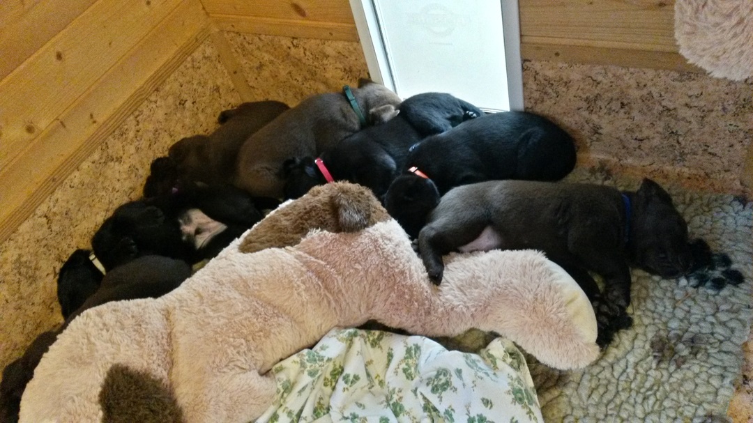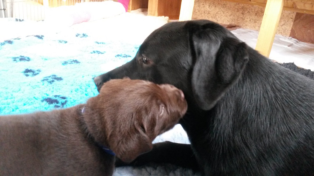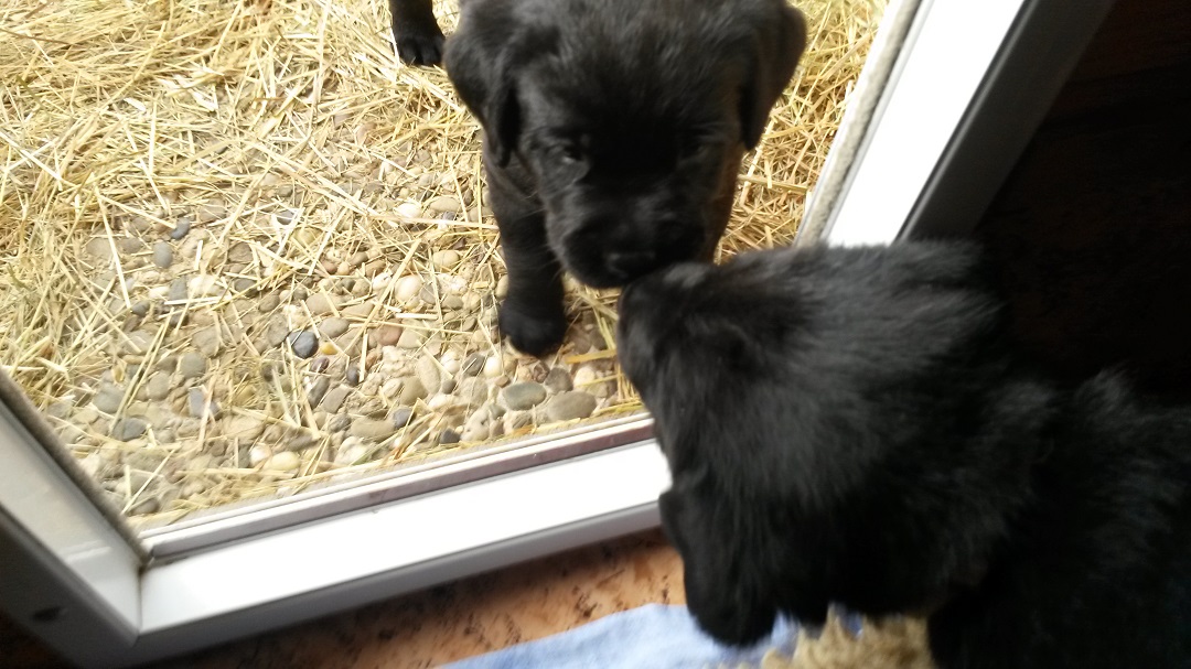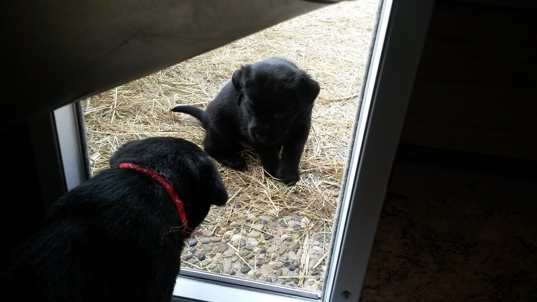 Leia ist manchmal mit im Gehege. Sie fährt voll auf die Welpen ab :-) |