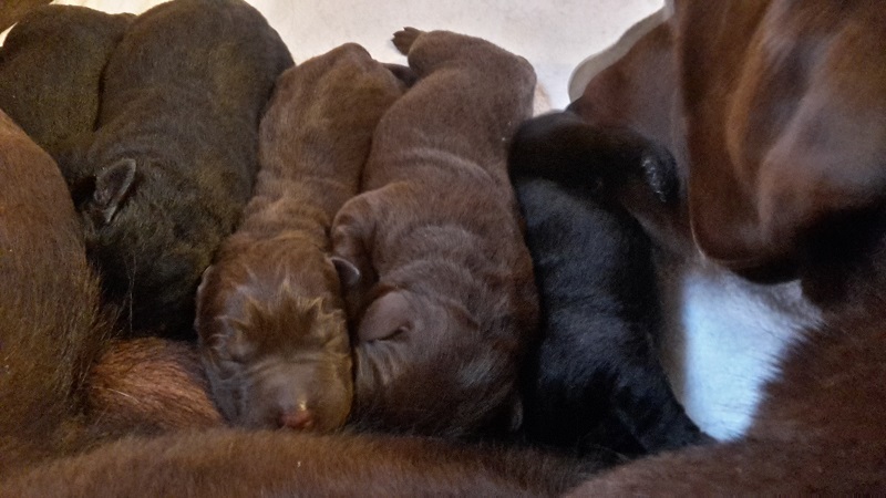 Somit haben wir nun: einen schwarzen und einen braunen Rüden, zwei schwarze Hündinnen und eine Braune.