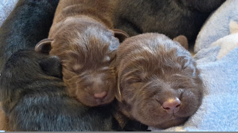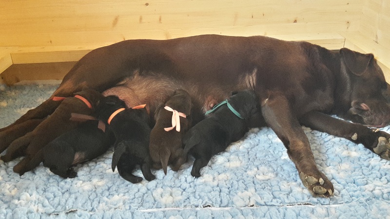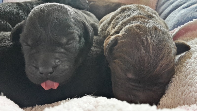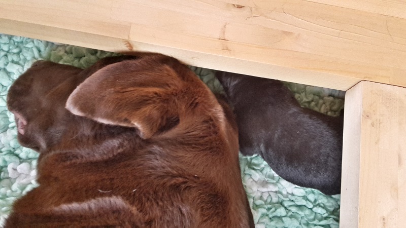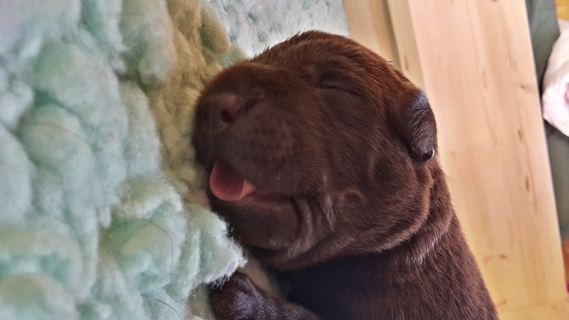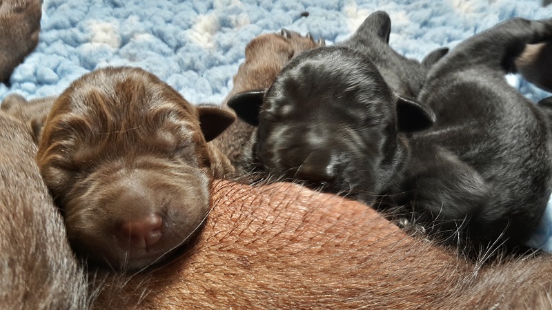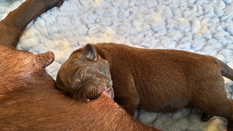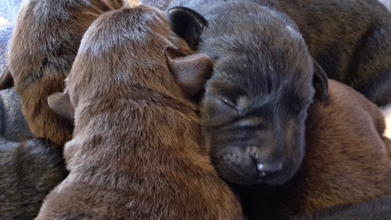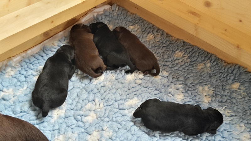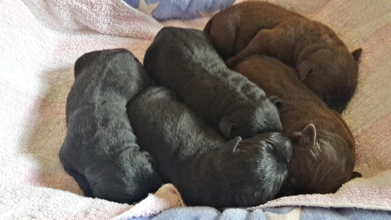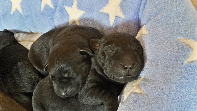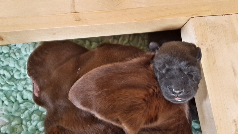 Links liegt die kleine braune Hündin, die Kessi heißen wird. Rechts daneben, das ist eine der beiden schwarzen Hündinnen. Im Moment noch ohne Namen :-). Gut, ich gebe zu, nicht ganz so schön getroffen, da sie beim Trinken gezappelt hat, doch trotzdem einfach "Zucker" mit den "Yoda" Öhrchen. | Noch soooo klein und trotzdem seit Sonntag, dem Tag ihrer Geburt, schon gewachsen. |